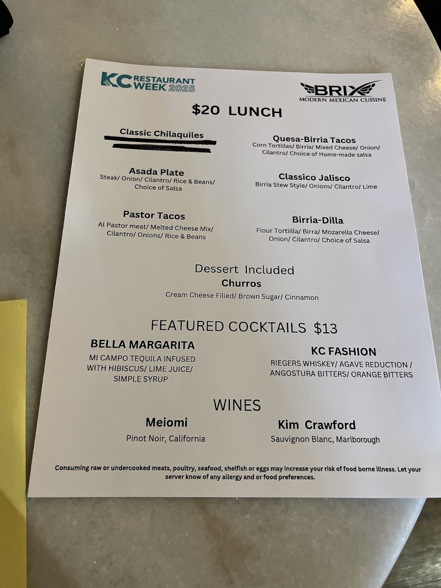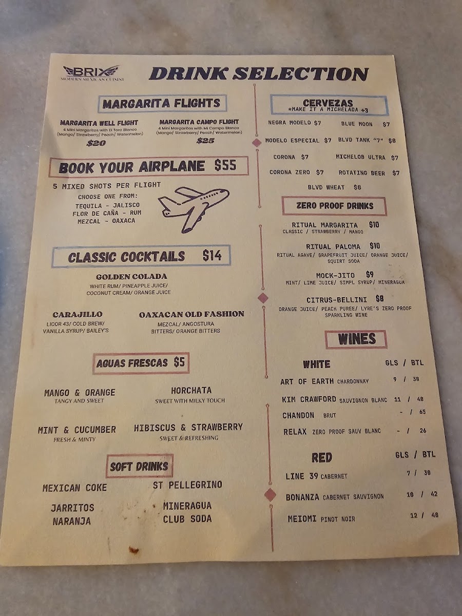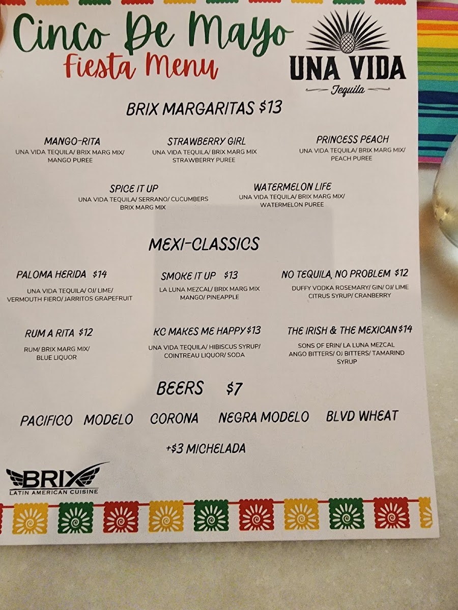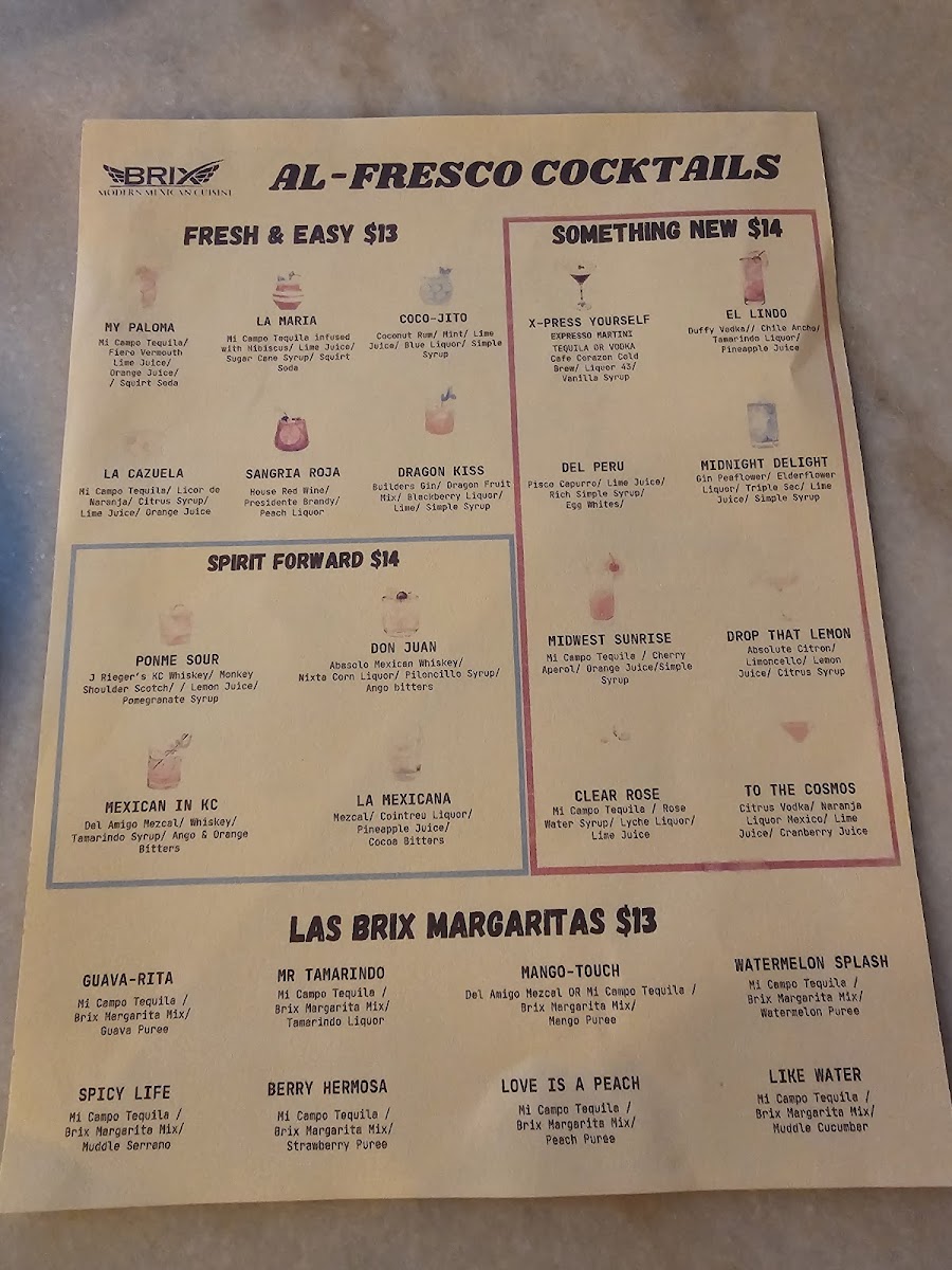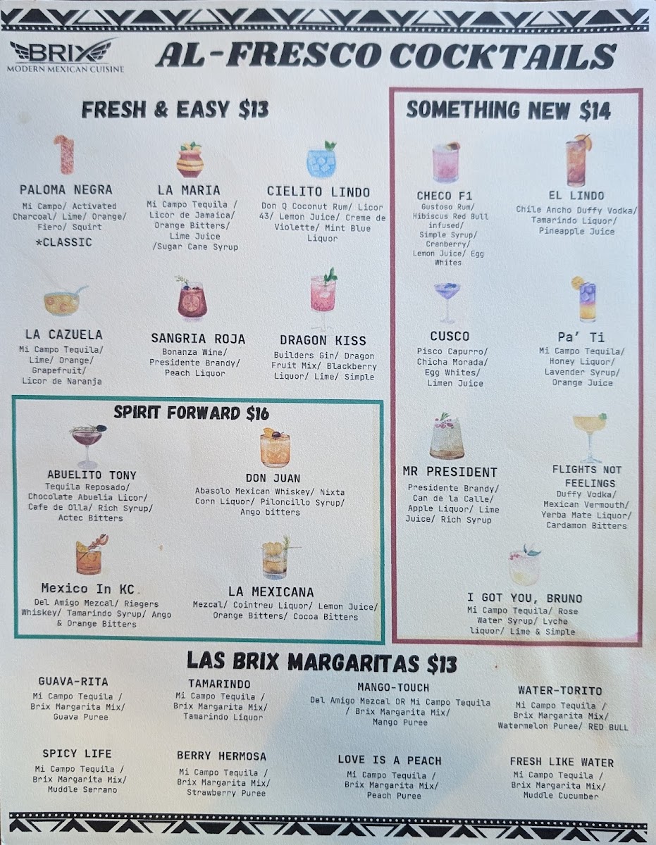 From a reviewer’s perspective, the menu at Brix Cantina - Westport delivers a lively and well-rounded snapshot of modern Mexican-inspired dining, blending bold flavors, creative drinks, and comforting classics. The beverage selection sets the tone, with margaritas like Like Water, Love Is A Peach, Mr. Tamarindo, Watermelon Splash, and Berry Hermosa offering playful twists, while non-alcoholic options such as mocktails Pineapple & Lemon, Mango Y Orange, Hibiscus & Strawberry, Mint & Cucumber, and Horchata Y Canela ensure everyone is included. Food-wise, tacos are a clear highlight, ranging from Quesa-Birria Tacos and Chicken Tacos to Al-Pastor Tacos, Asada Tacos, and Camaron Tacos, all supported by practical sides like Rice & Beans, Nacho Cheese, 6oz Guacamole, Shredded Cheese, and Corn Tortillas. The menu expands further with hearty options such as the Brix Plate, indulgent Pizza-Dilla, and satisfying burritos including Chicken Burrito, Birria Burrito, Al-Pastor Burrito, and Asada Burrito, alongside crowd-pleasing quesadillas like Asada Quesadilla, Chicken Quesadilla, and Al-Pastor Quesadilla. Drink lovers will appreciate the mix of cocktails under Mexi-Favorites-La Maria, Mexican In KC, Dragon's Kiss, My Paloma, and Dealers Choice-as well as Good Old Classics such as Pisco Sour, X-Press Yourself, To The Cosmos, and Drop That Lemon. Beer and refreshment options, from Modelo Especial and Corona to Michelob Ultra, Corona Zero (Non Alcoholic), Rotating Beer, Jarritos Piña, Dr Pepper, Mineragua, Pepsi, and Diet Pepsi, round out the experience. Finally, desserts like Cheesecake and Churros provide a sweet finish, making the menu feel complete, versatile, and thoughtfully curated-an inviting conclusion to any visit at this Westport spot.