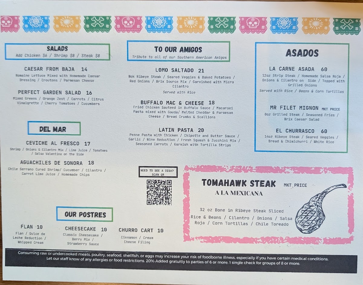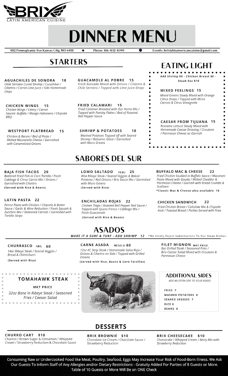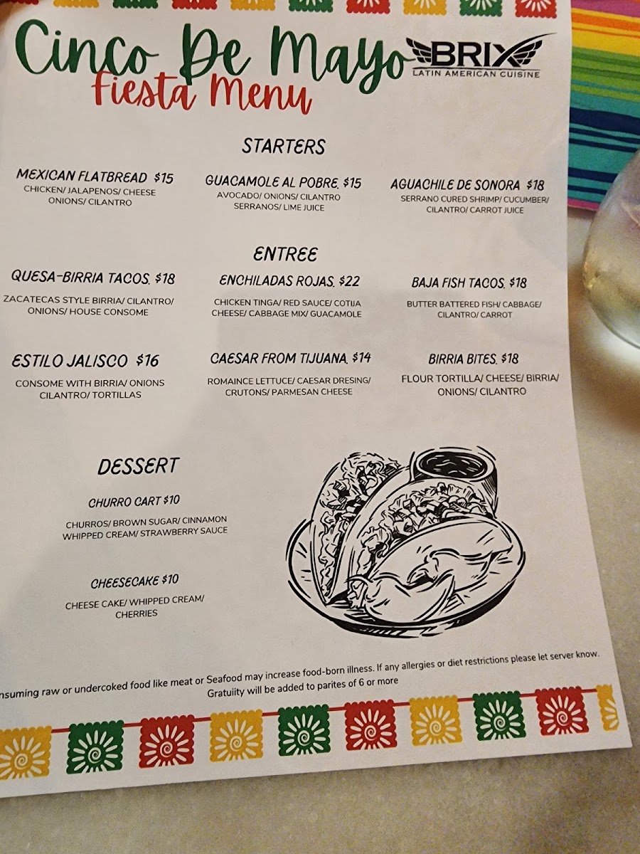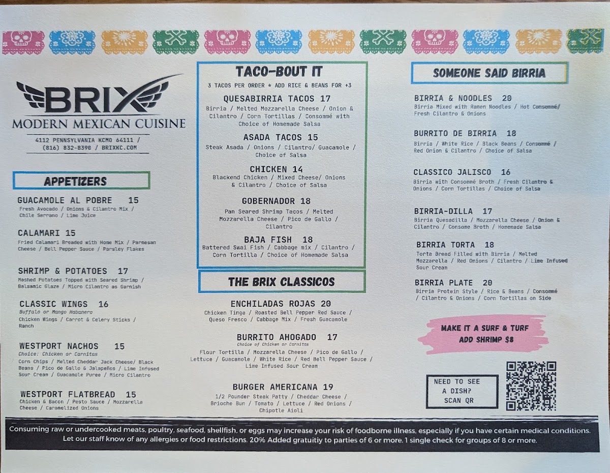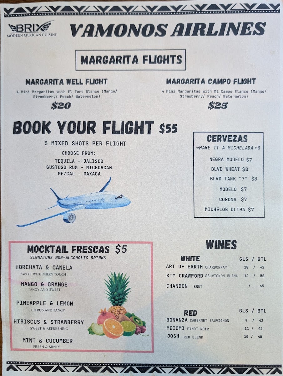 From a reviewer’s perspective, the menu at Brix Cantina - Westport delivers a lively and well-rounded snapshot of modern Mexican-inspired dining, blending bold flavors, creative drinks, and comforting classics. The beverage selection sets the tone, with margaritas like Like Water, Love Is A Peach, Mr. Tamarindo, Watermelon Splash, and Berry Hermosa offering playful twists, while non-alcoholic options such as mocktails Pineapple & Lemon, Mango Y Orange, Hibiscus & Strawberry, Mint & Cucumber, and Horchata Y Canela ensure everyone is included. Food-wise, tacos are a clear highlight, ranging from Quesa-Birria Tacos and Chicken Tacos to Al-Pastor Tacos, Asada Tacos, and Camaron Tacos, all supported by practical sides like Rice & Beans, Nacho Cheese, 6oz Guacamole, Shredded Cheese, and Corn Tortillas. The menu expands further with hearty options such as the Brix Plate, indulgent Pizza-Dilla, and satisfying burritos including Chicken Burrito, Birria Burrito, Al-Pastor Burrito, and Asada Burrito, alongside crowd-pleasing quesadillas like Asada Quesadilla, Chicken Quesadilla, and Al-Pastor Quesadilla. Drink lovers will appreciate the mix of cocktails under Mexi-Favorites-La Maria, Mexican In KC, Dragon's Kiss, My Paloma, and Dealers Choice-as well as Good Old Classics such as Pisco Sour, X-Press Yourself, To The Cosmos, and Drop That Lemon. Beer and refreshment options, from Modelo Especial and Corona to Michelob Ultra, Corona Zero (Non Alcoholic), Rotating Beer, Jarritos Piña, Dr Pepper, Mineragua, Pepsi, and Diet Pepsi, round out the experience. Finally, desserts like Cheesecake and Churros provide a sweet finish, making the menu feel complete, versatile, and thoughtfully curated-an inviting conclusion to any visit at this Westport spot.